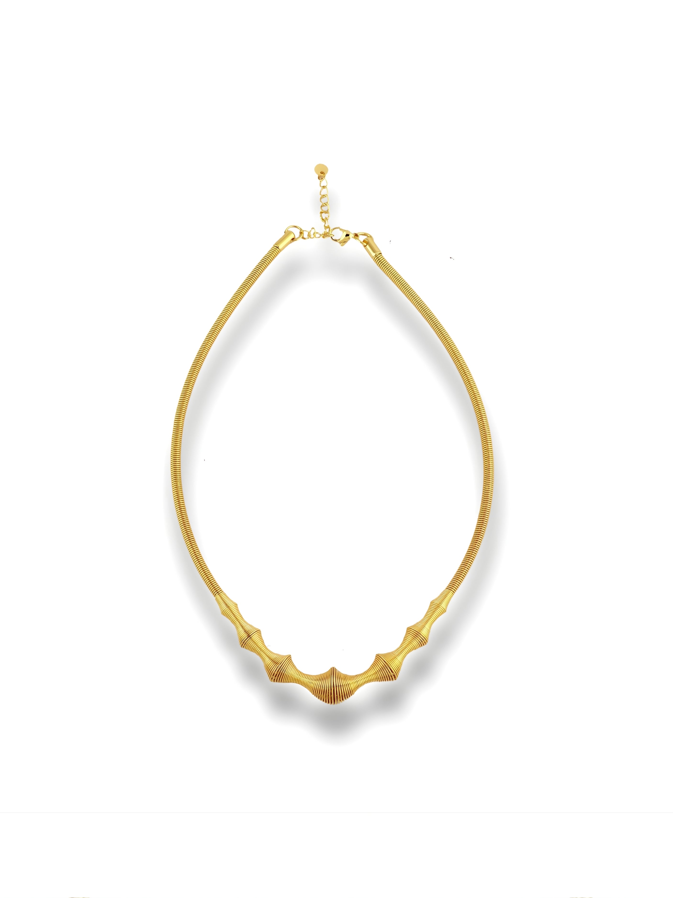 Tightly wound bands create ribbed texture along the choker. Central V shape flows into wave like peaks and valleys. Made from strong stainless steel with metallic finish, it looks modern and sculptural. Artistic organic design stands out.