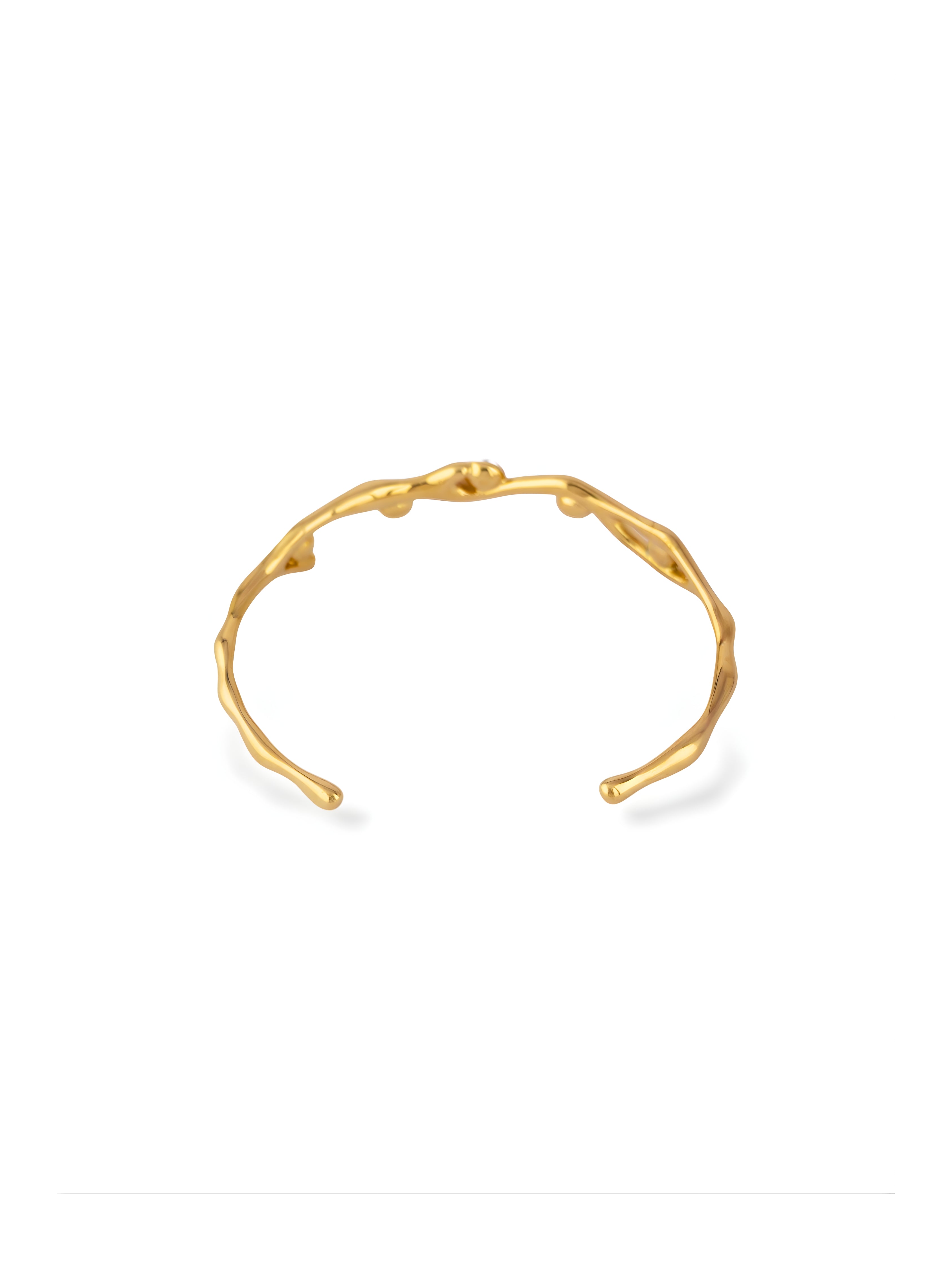 This beautiful gold-tone bangle is inspired by the natural shapes of branches. It features five smooth white pearls that add a touch of class. The open design makes it easy to wear and perfect for any special occasion.
