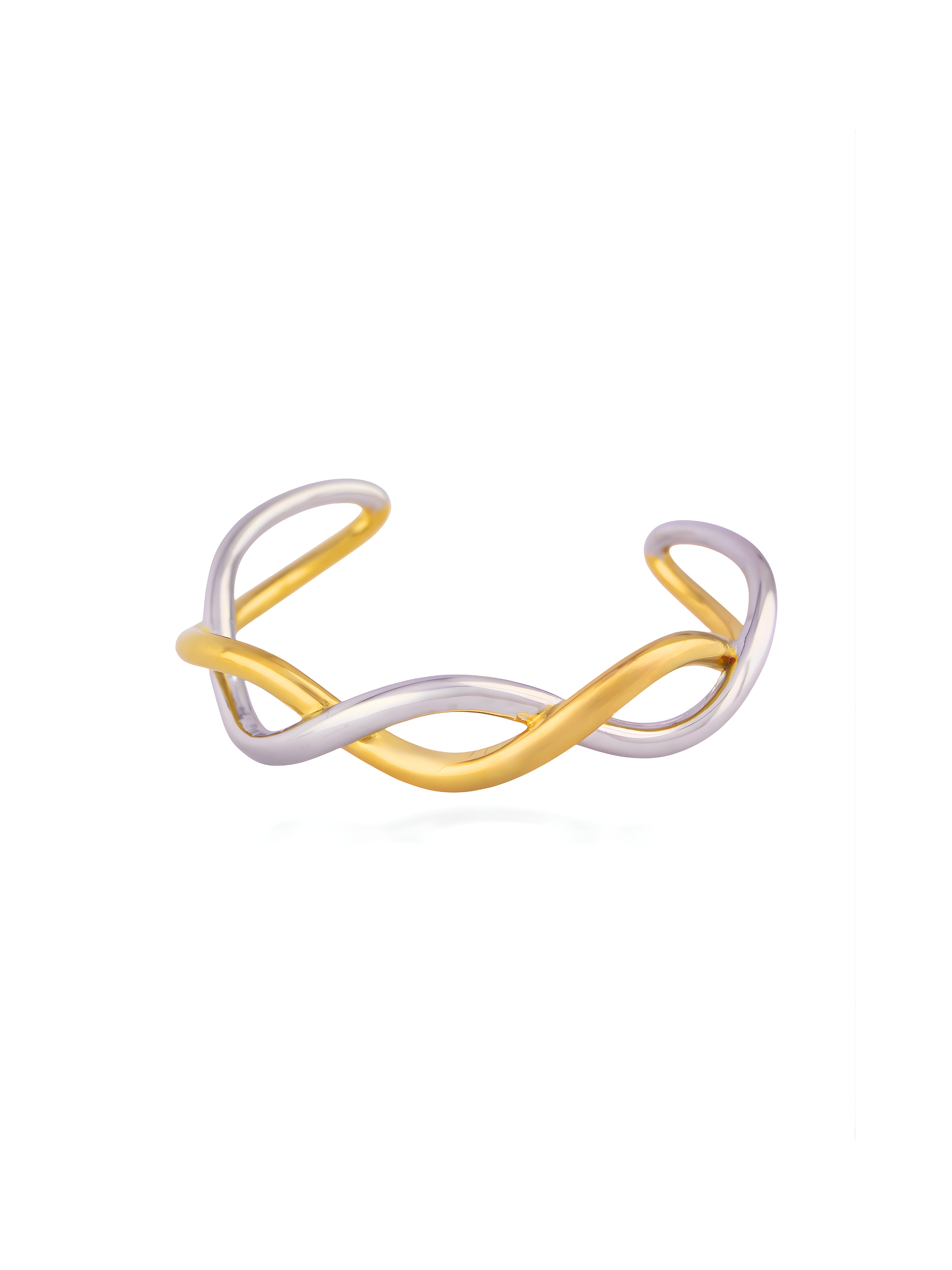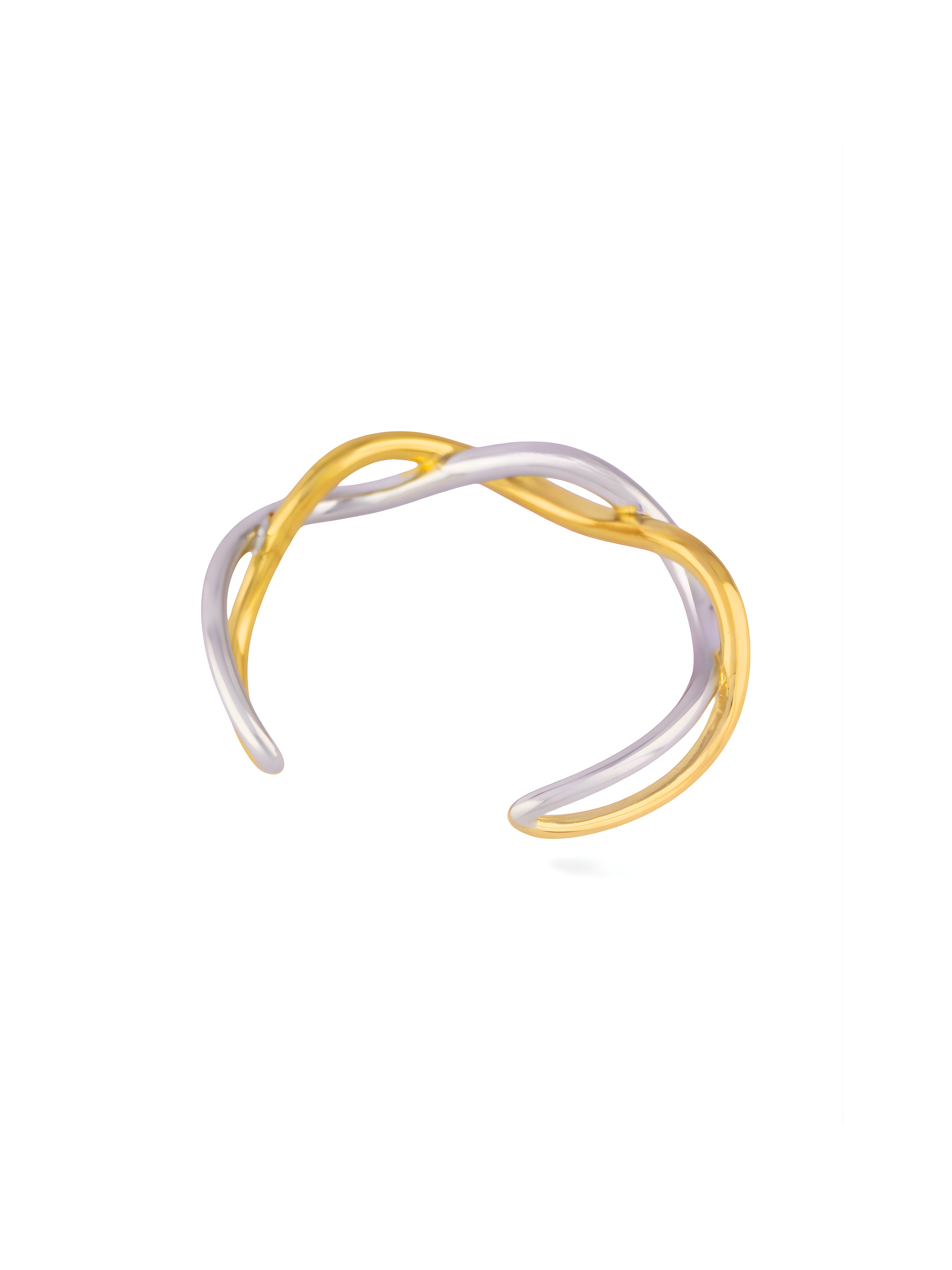 This beautiful cuff features intertwined bands of gold and silver for a modern, twisted look. Its open design makes it easy to wear and perfect for stacking. This simple piece adds a touch of elegance to any outfit.