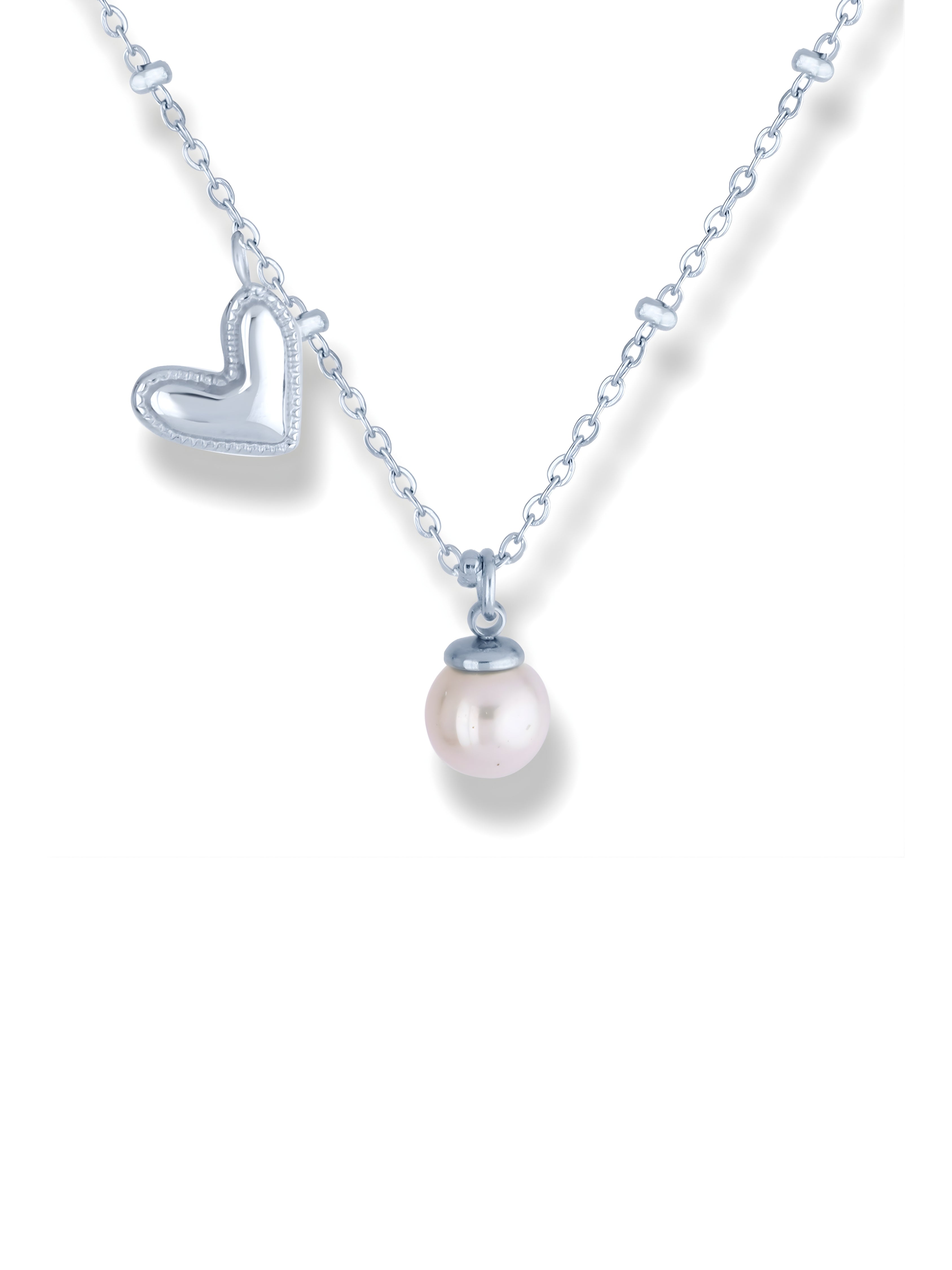 Puffed heart charm and white pearl drop hang from a beaded chain. Small spherical beads accent the chain for added texture. Made from strong stainless steel with metallic finish, it looks modern and elegant. Romantic design stands out.