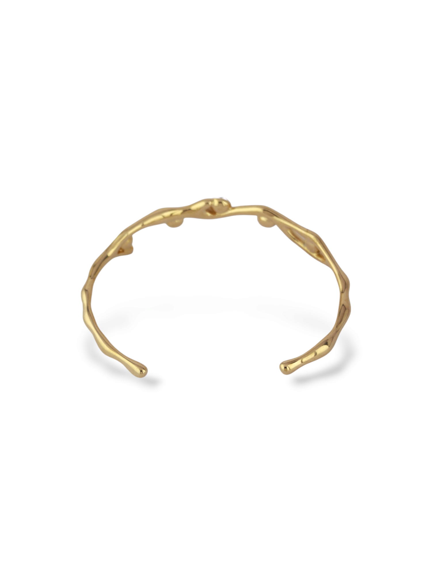 This beautiful gold-tone bangle is inspired by the natural shapes of branches. It features five smooth white pearls that add a touch of class. The open design makes it easy to wear and perfect for any special occasion.