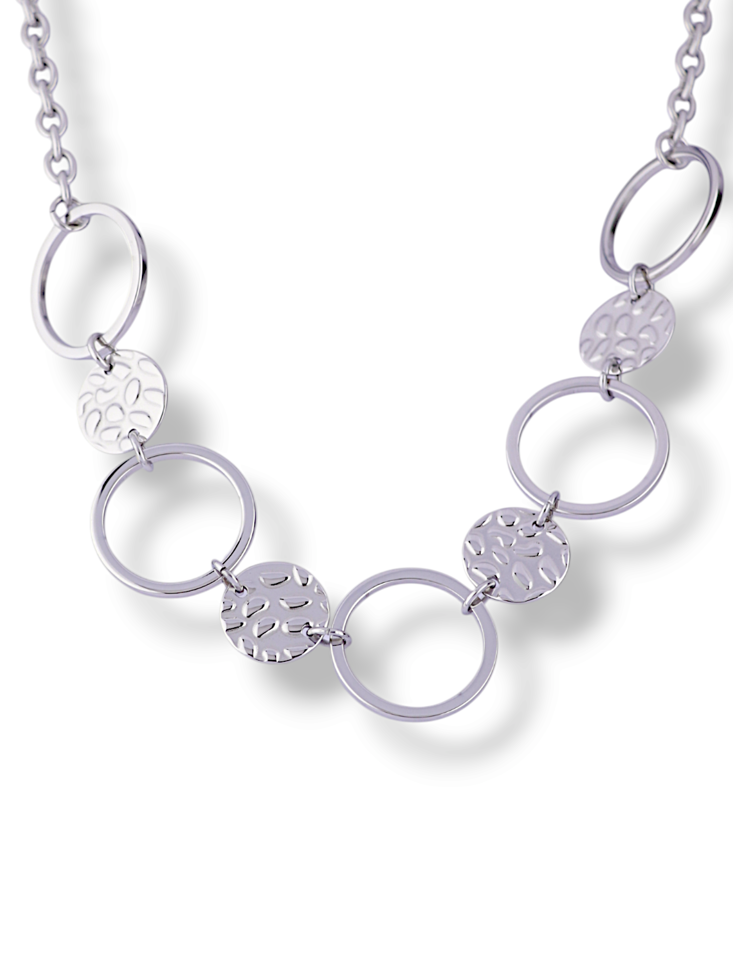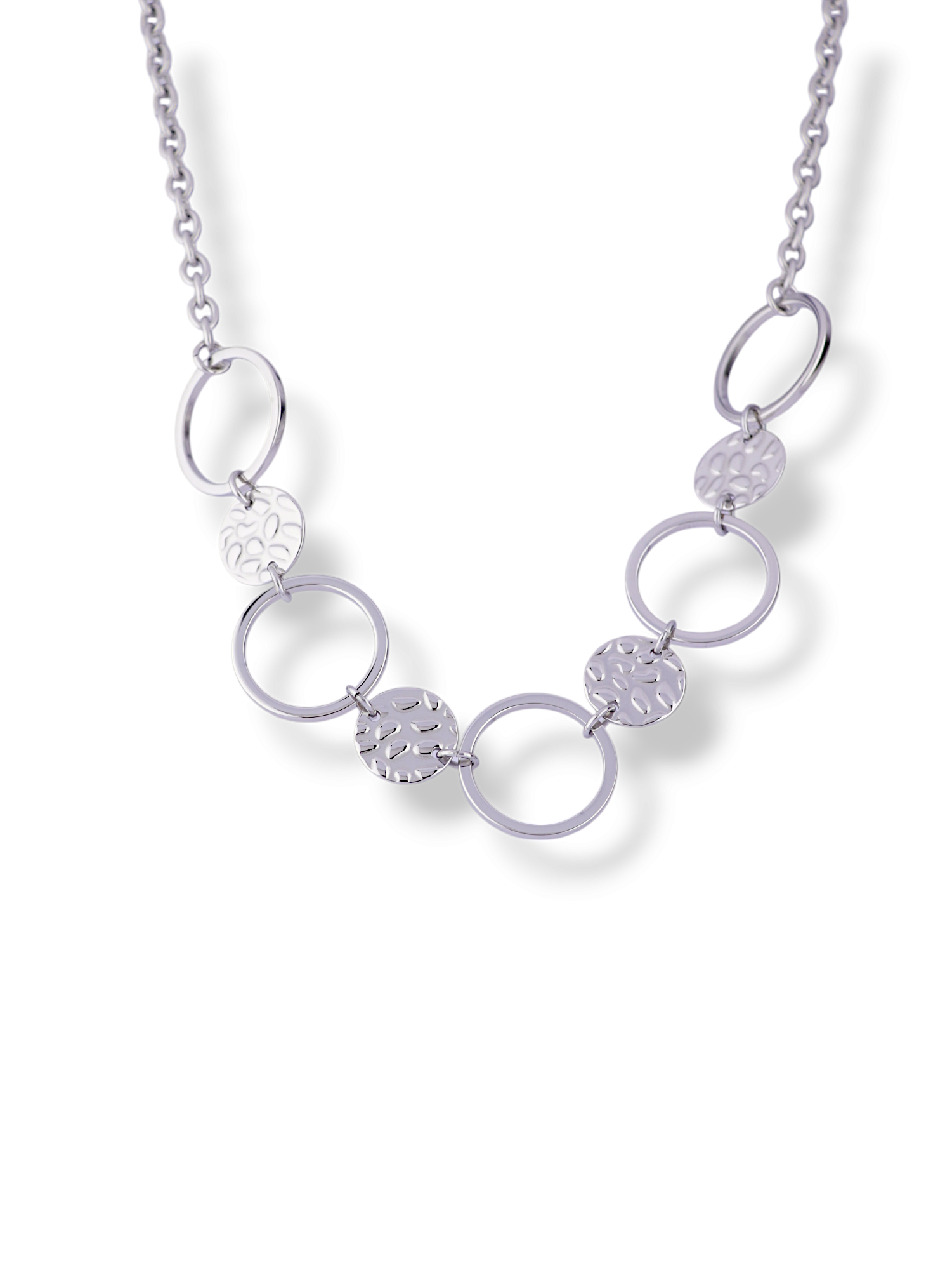 Brighten your outfit with this stylish silver necklace. It features a beautiful mix of textured discs and polished rings on a delicate chain. This simple yet elegant piece is perfect for adding a modern touch to your daily look.