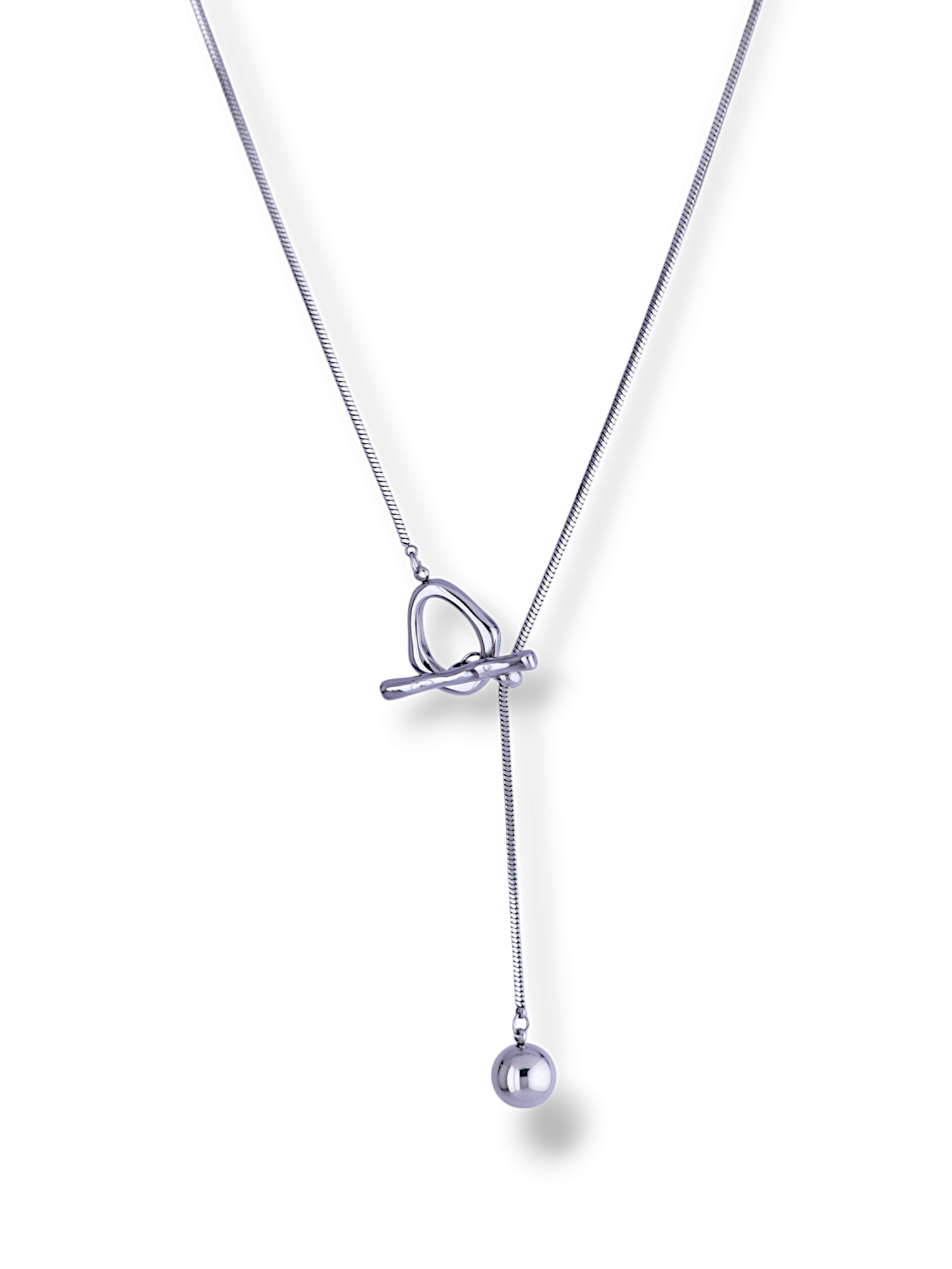 This silver necklace features a smooth round ball and a stylish adjustable loop. Its simple, sliding design makes it a perfect choice for adding a modern and elegant touch to any outfit, day or night.