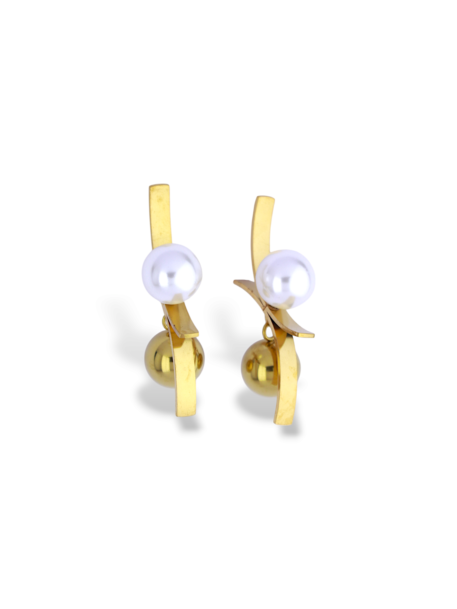 Pearl Orbit earrings feature a smooth gold curve with a soft pearl detail. The design feels light, modern, and elegant. Easy to wear every day and perfect for adding a gentle shine to any outfit.