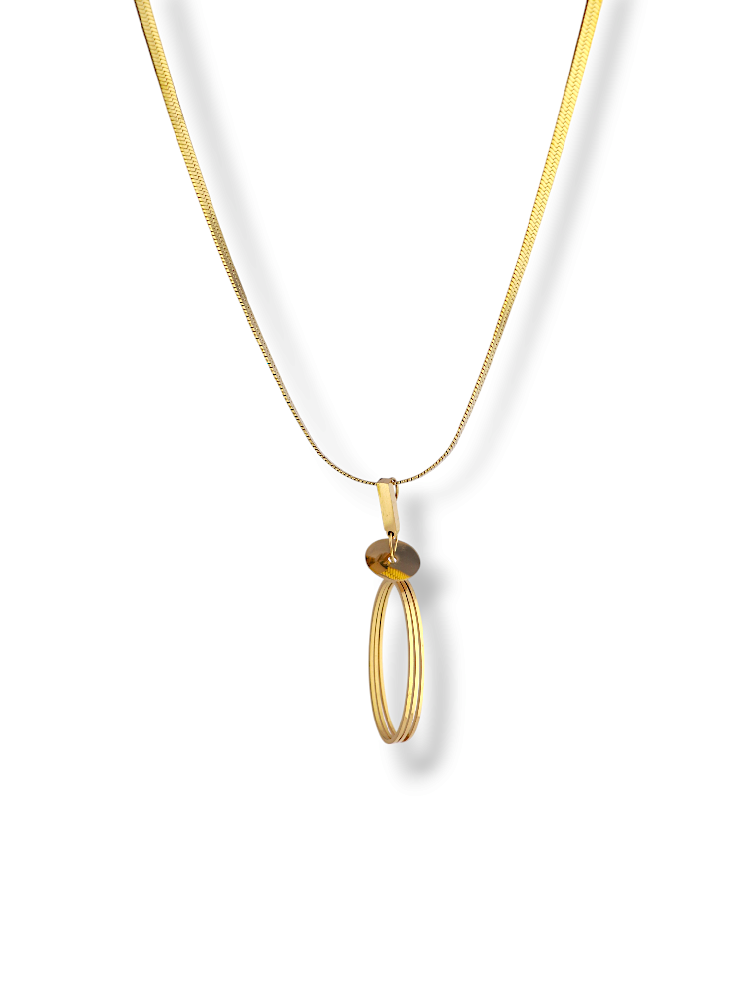 This gold set has a slim oval pendant necklace with matching long oval earrings. It looks clean, modern, and stylish. Easy to wear every day or for special moments. Light, simple, and elegant.