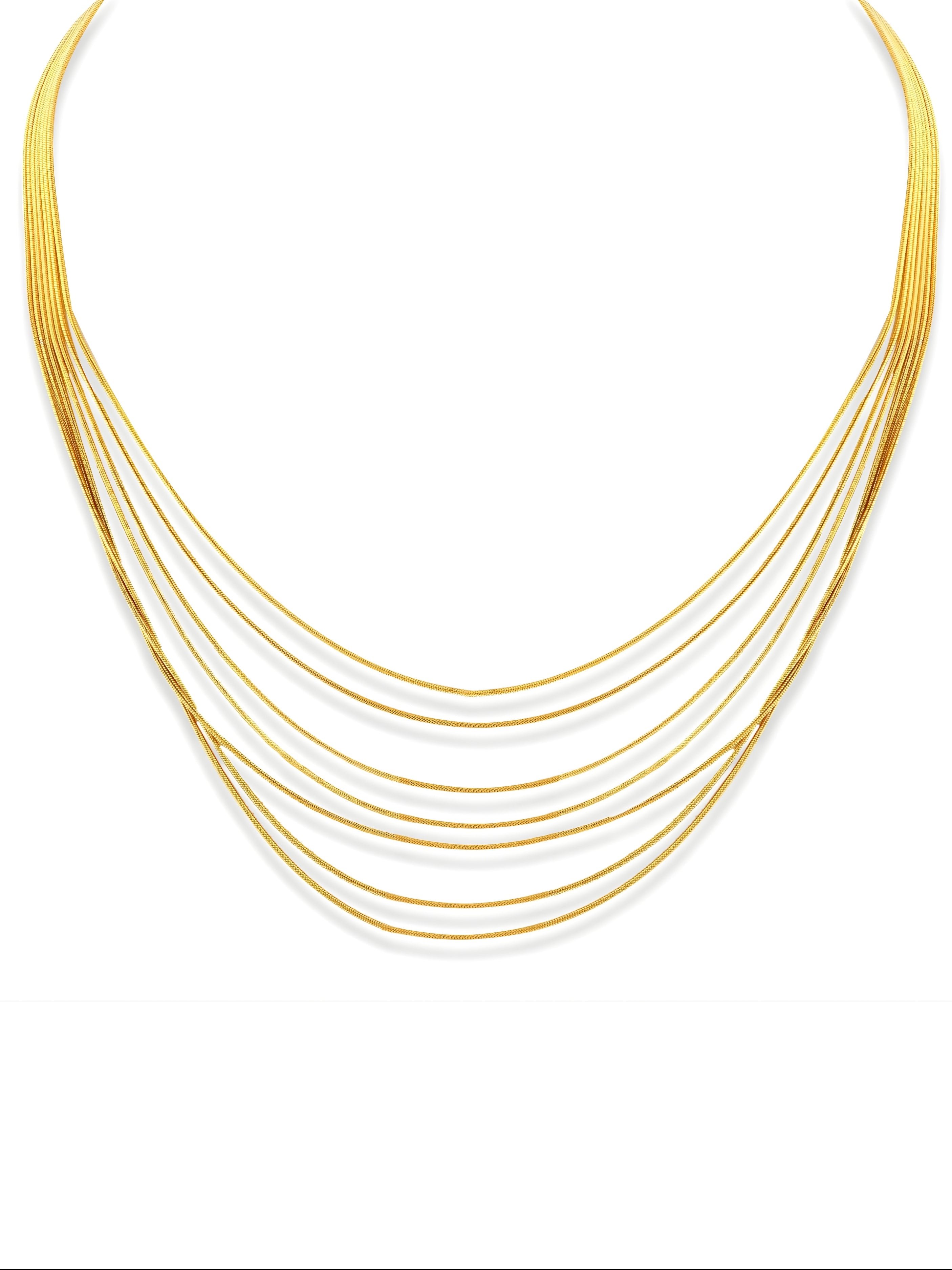 Add a bold touch to your style with this stunning gold necklace. It features multiple layers of smooth snake chains that drape beautifully. This elegant piece is perfect for dressing up any outfit and making a simple, stylish statement.